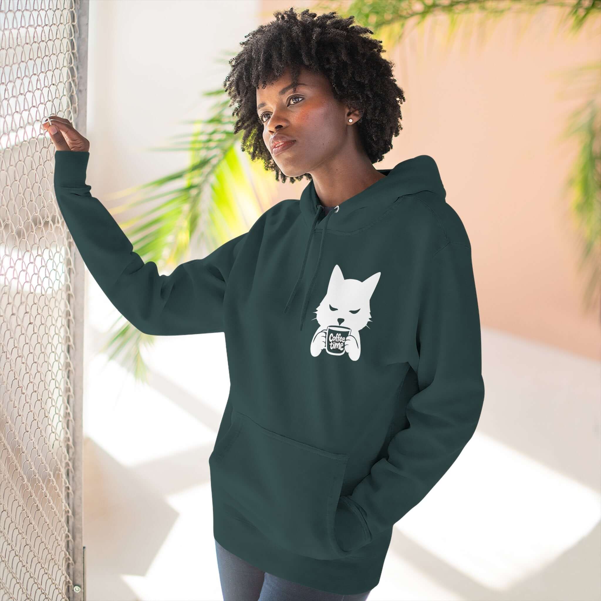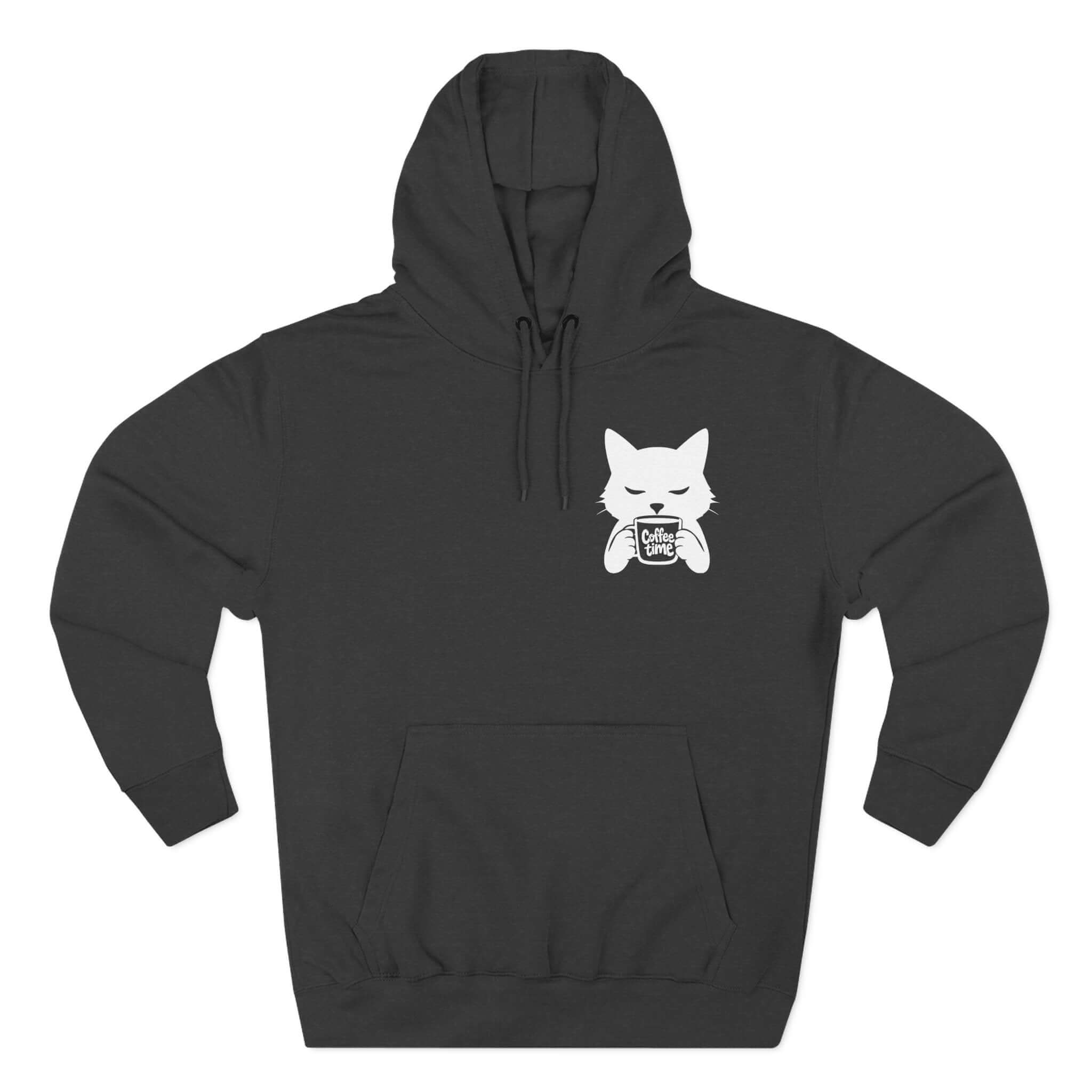 Indulge in comfort with our cozy Cat Coffee Time Graphic Fleece Hoodie. Crafted from soft 3-end fleece, it features a roomy kangaroo pouch pocket, adjustable hood, and durable twill necktape construction. Experience the luxurious hand-feel of the combed ring-spun cotton blend with low shrinkage. Whether for reading, coffee runs, or casual meetups, this hoodie combines durability with a soft touch for all-day comfort. Available in various sizes and colors to suit your style.