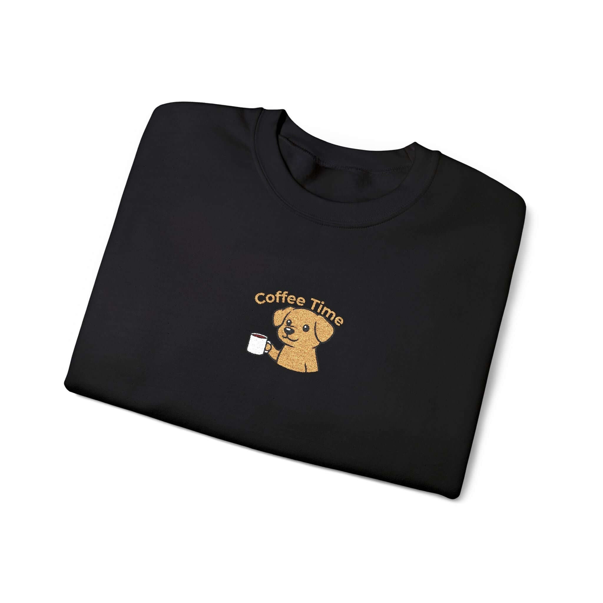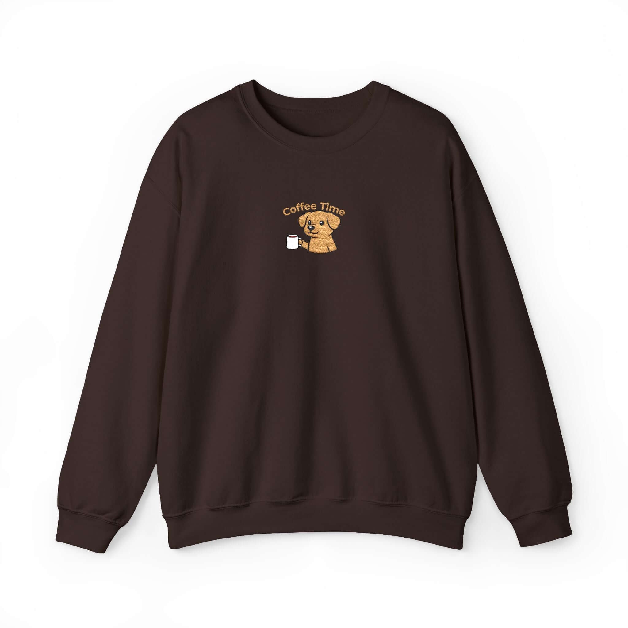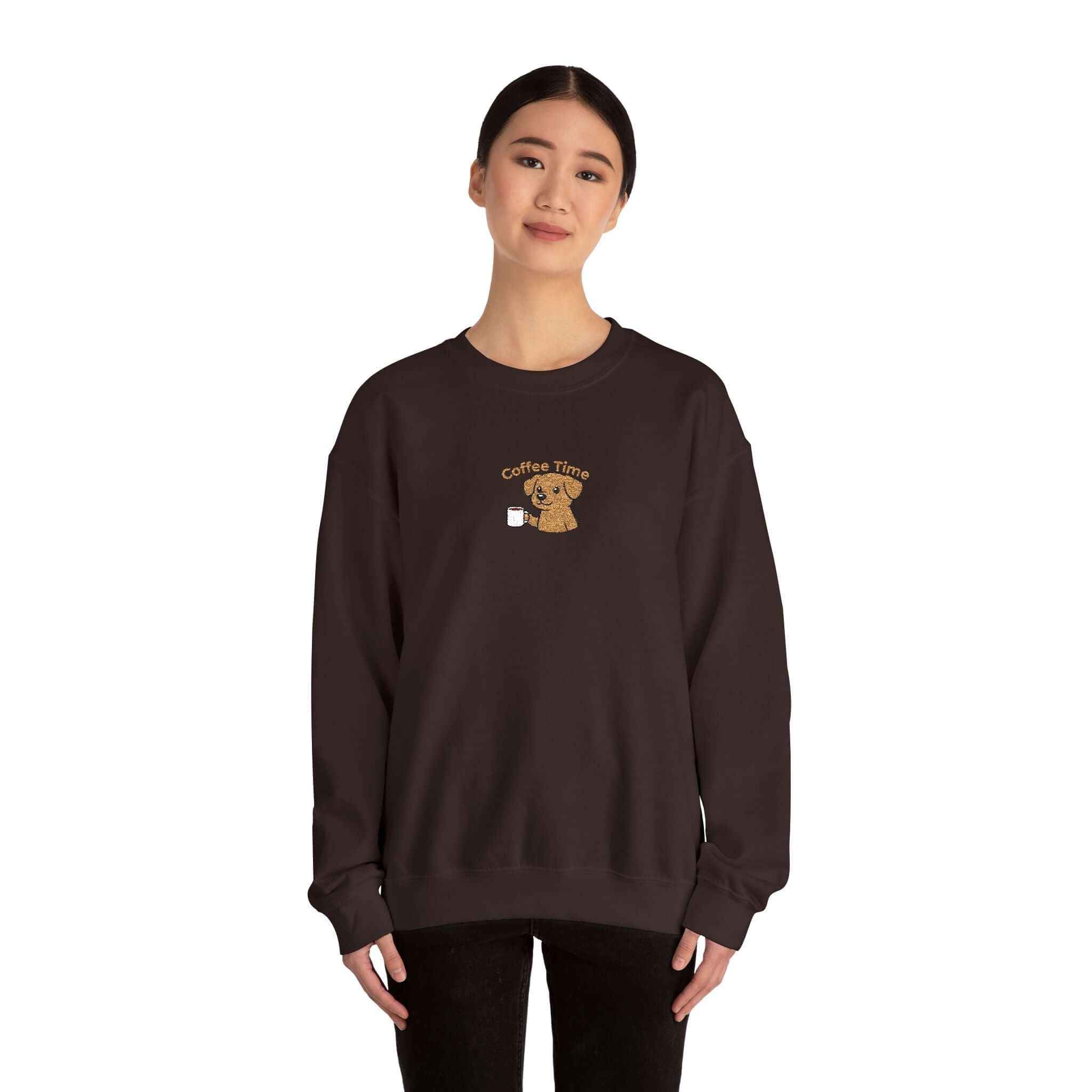 Indulge in comfort and style with our Cute Coffee Dog Embroidered Crewneck Sweatshirt. Embrace warmth and playfulness whether relaxing at home or hitting the streets for your coffee fix. Crafted from a cozy black midweight knit, this sweatshirt offers a familiar feel that retains its shape wash after wash. The charming embroidered dog holding a cup near your heart provides a unique, handmade aesthetic without overwhelming your ensemble. Perfect for layering or solo wear with jeans and boots, this sweatshirt is your go-to for both coziness and flair. Enjoy features like a tubular, seamless body, a durable 50/50 cotton-poly blend, and double-needle stitching for lasting quality. Treat yourself to everyday comfort with character.