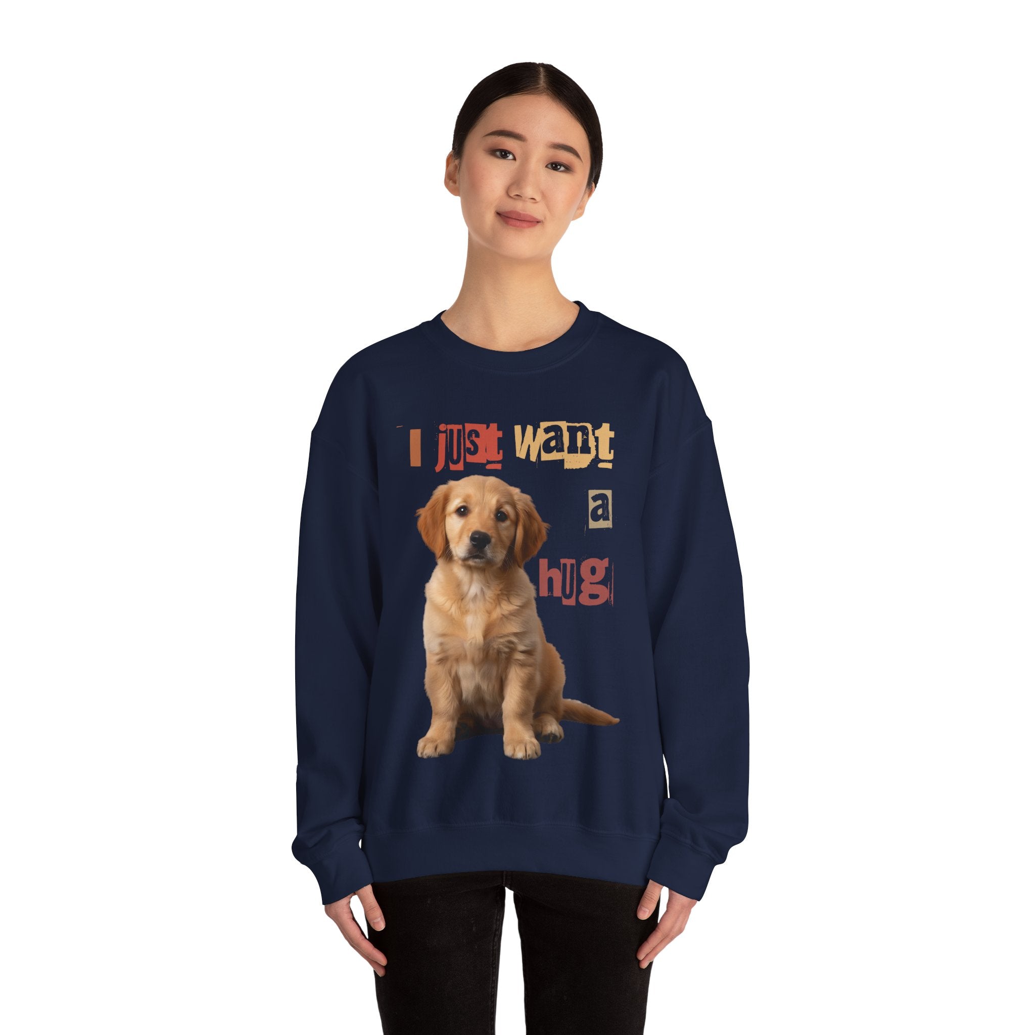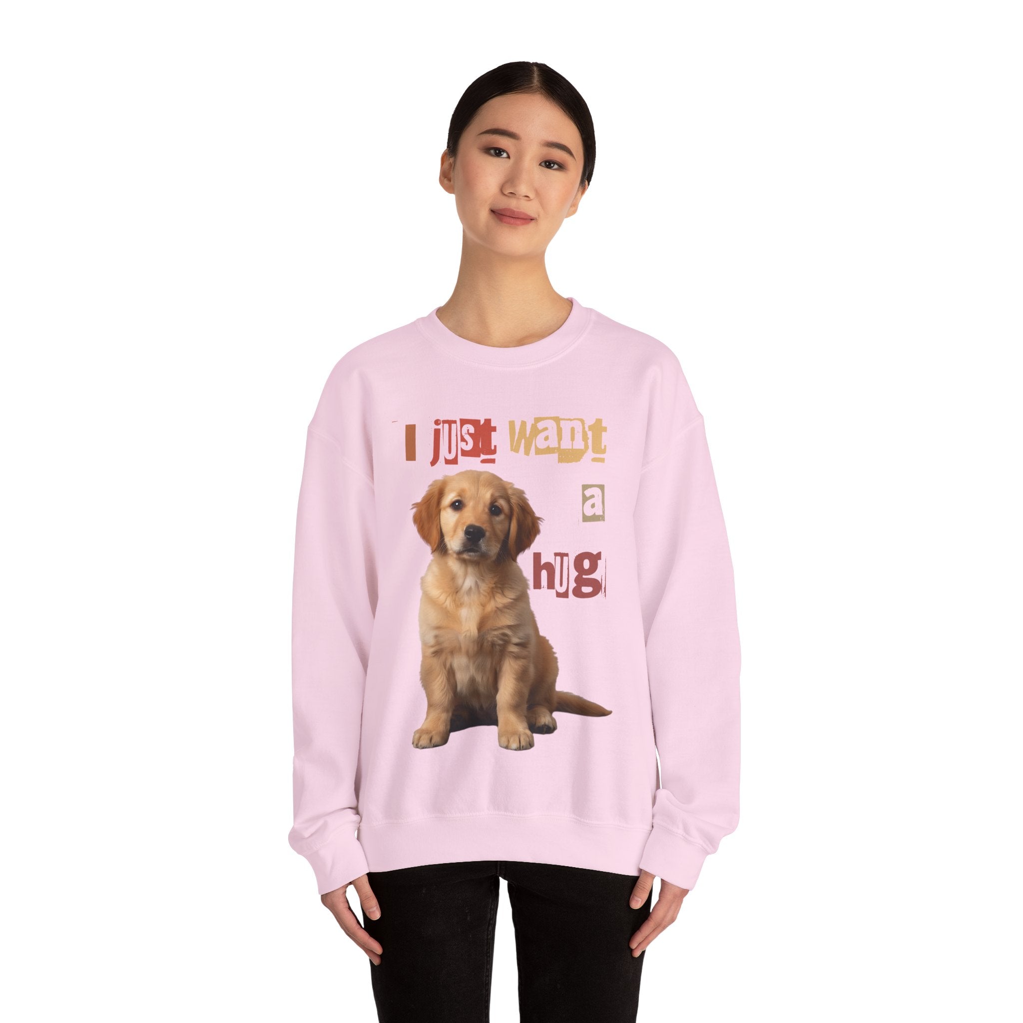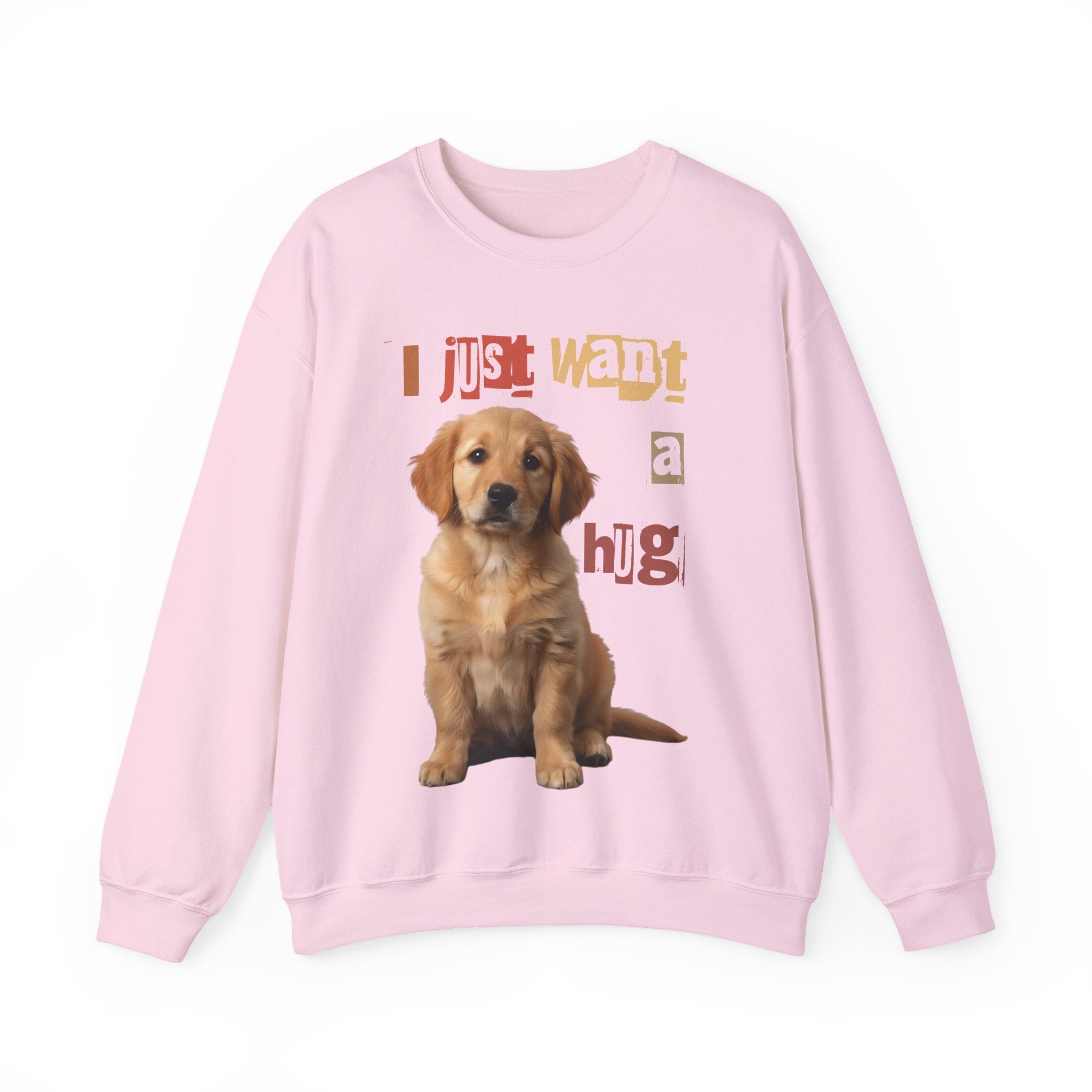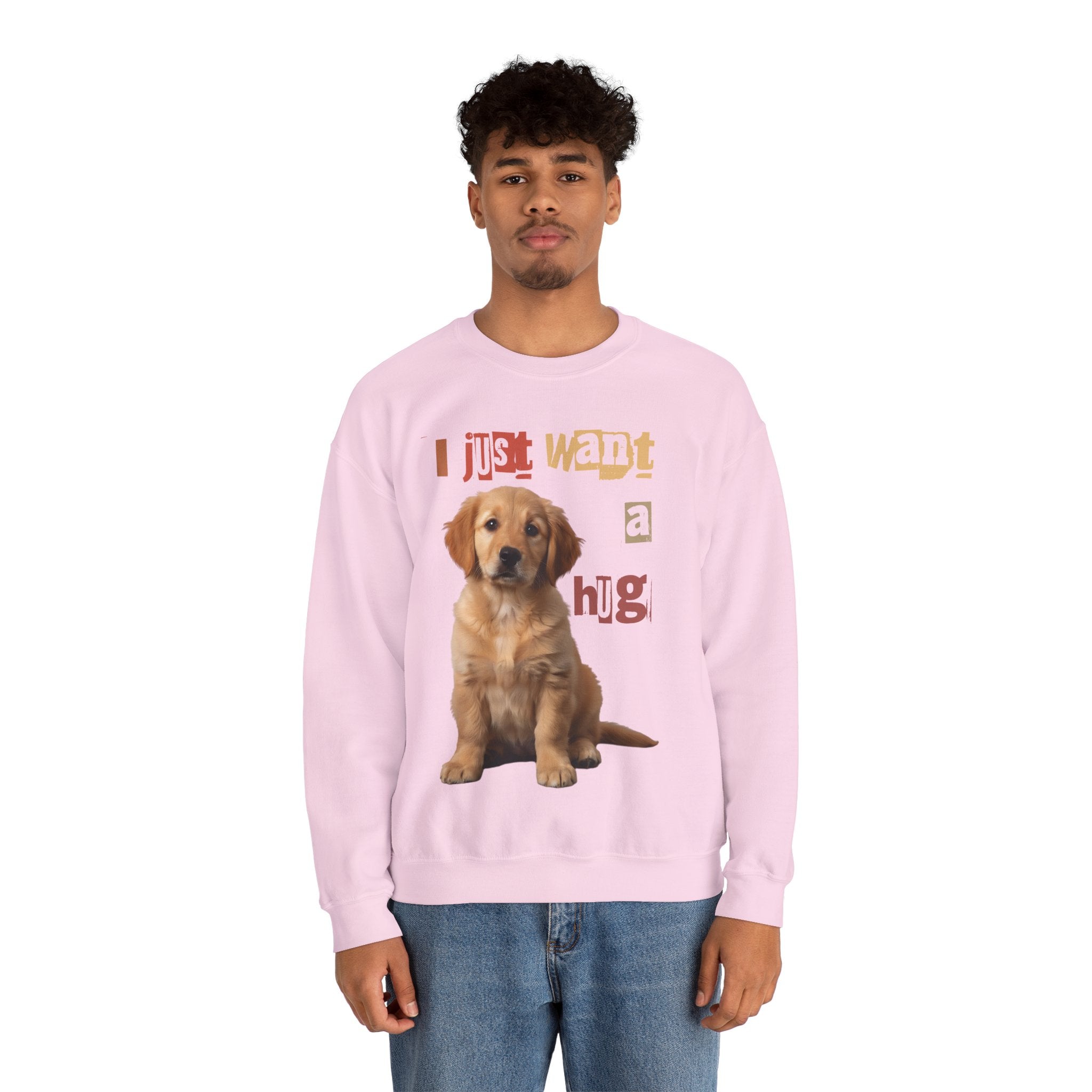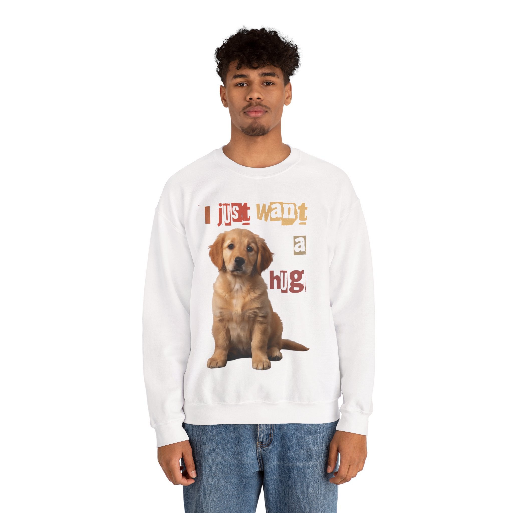 This cute Dog Hug Print Unisex Crewneck Sweatshirt brings a warm and playful vibe to your everyday wardrobe. Featuring a wide-eyed ginger dog with retro-style lettering that saysI just want a hug,this sweatshirt offers instant comfort and a touch of nostalgia. Crafted from a medium-heavy 50/50 cotton-poly blend, it ensures both comfort and durability. The ribbed collar, double-needle stitching, and tear-away neck label add to its quality. Perfect for layering on cool days or lounging around at home, this sweatshirt is ethically made cotton with OEKO-TEX certified dyes. Embrace cozy moments with this charming piece.