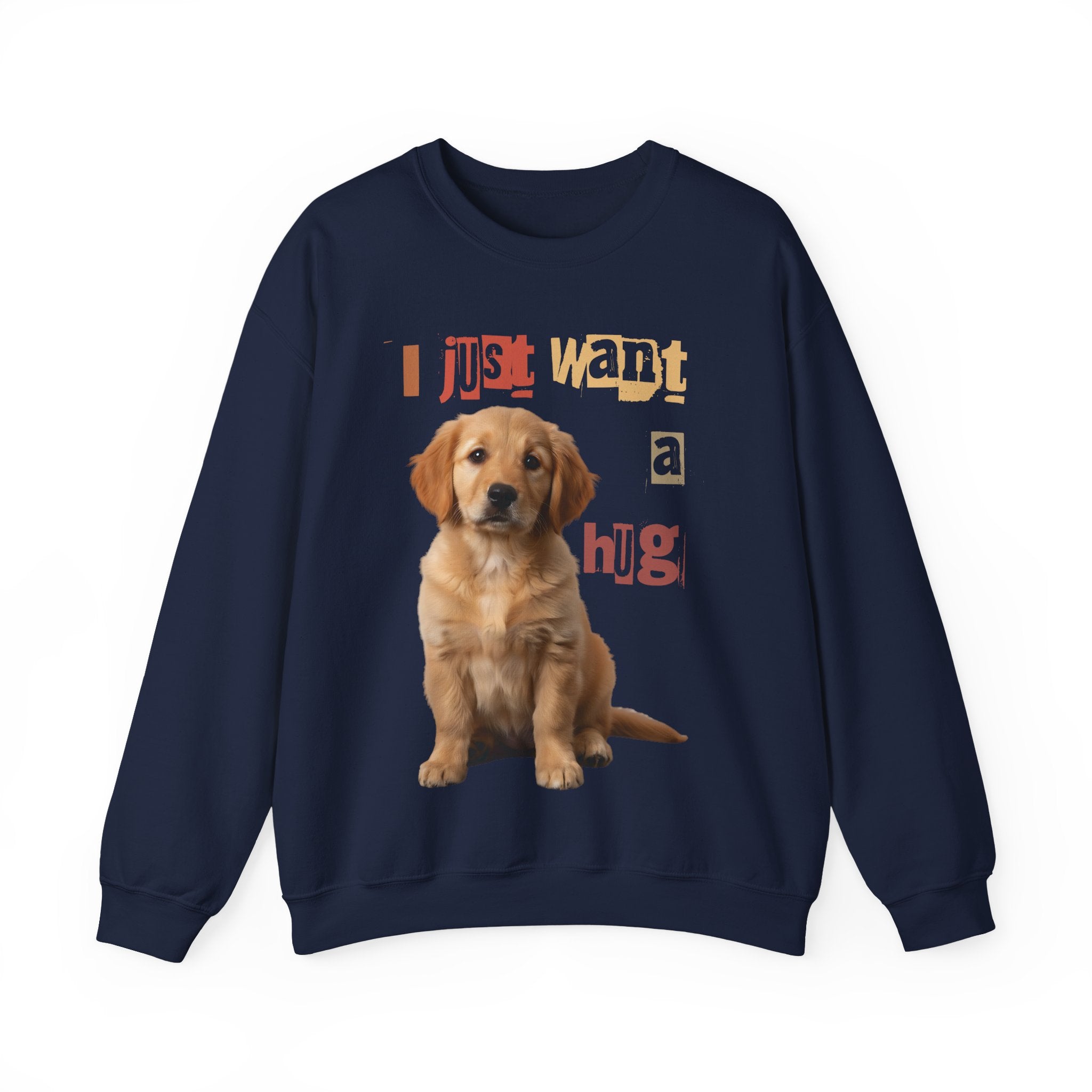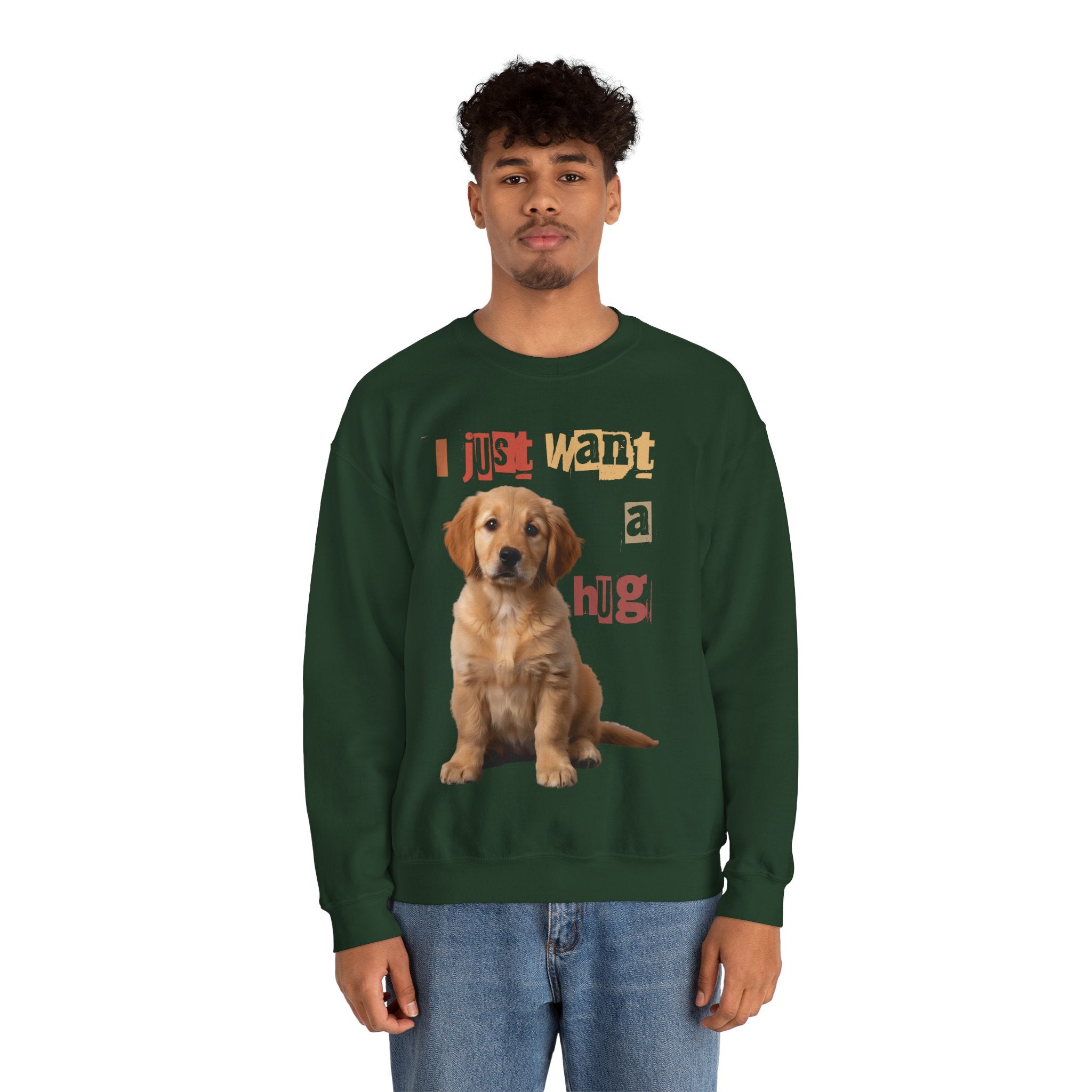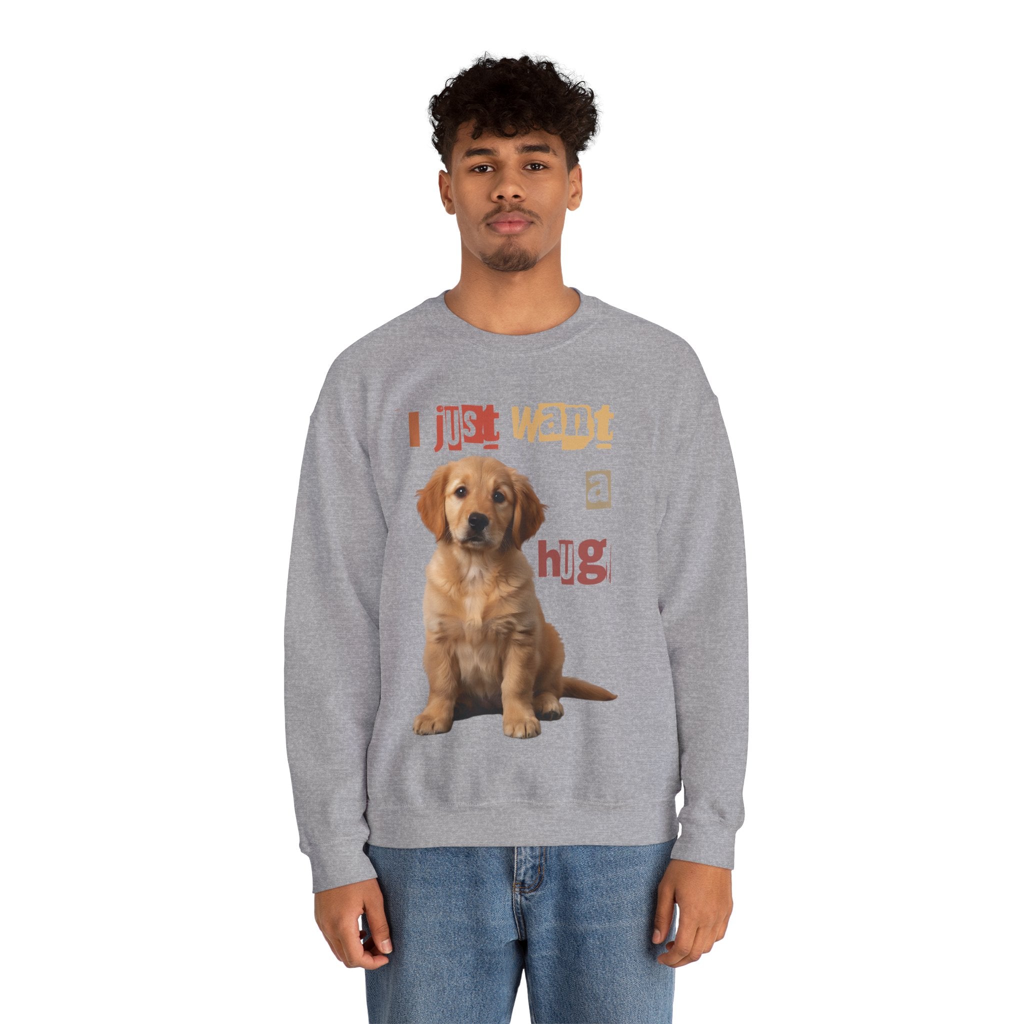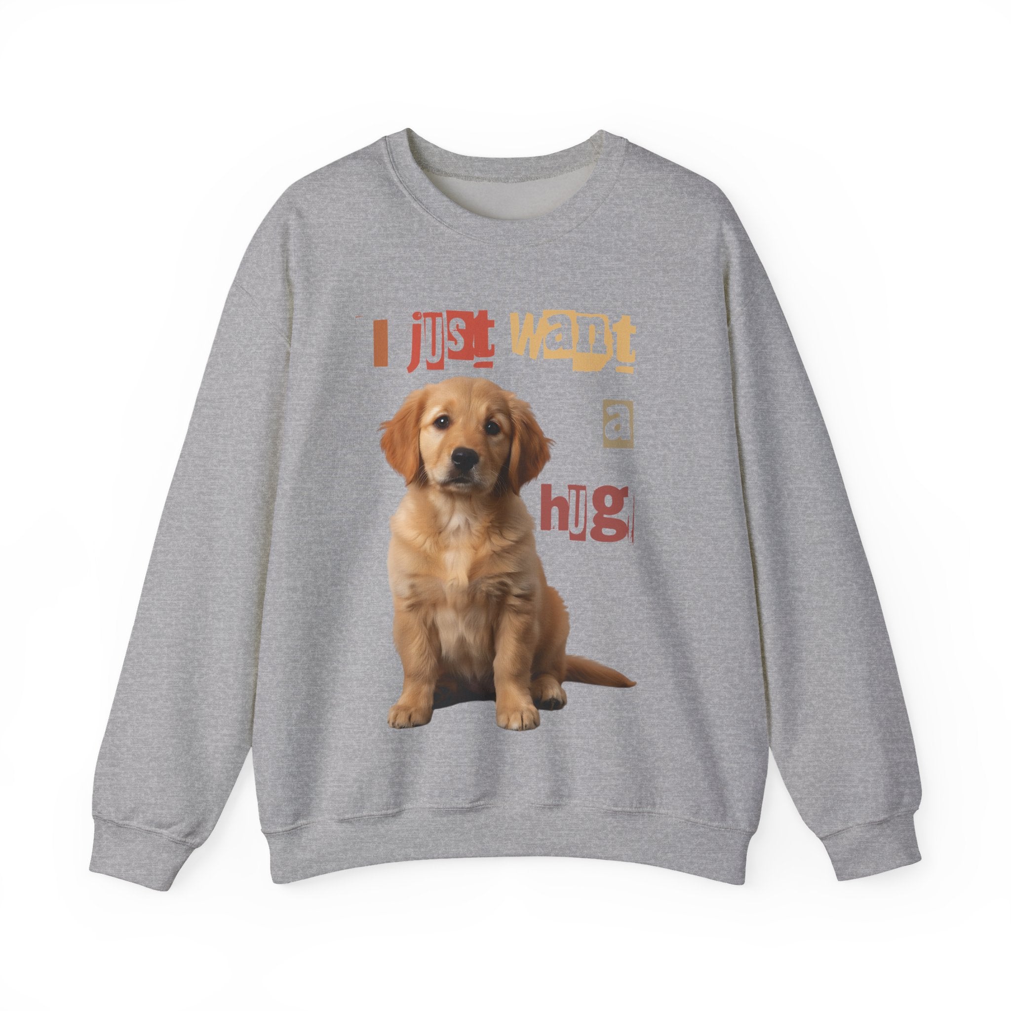 This cute Dog Hug Print Unisex Crewneck Sweatshirt brings a warm and playful vibe to your everyday wardrobe. Featuring a wide-eyed ginger dog with retro-style lettering that saysI just want a hug,this sweatshirt offers instant comfort and a touch of nostalgia. Crafted from a medium-heavy 50/50 cotton-poly blend, it ensures both comfort and durability. The ribbed collar, double-needle stitching, and tear-away neck label add to its quality. Perfect for layering on cool days or lounging around at home, this sweatshirt is ethically made cotton with OEKO-TEX certified dyes. Embrace cozy moments with this charming piece.