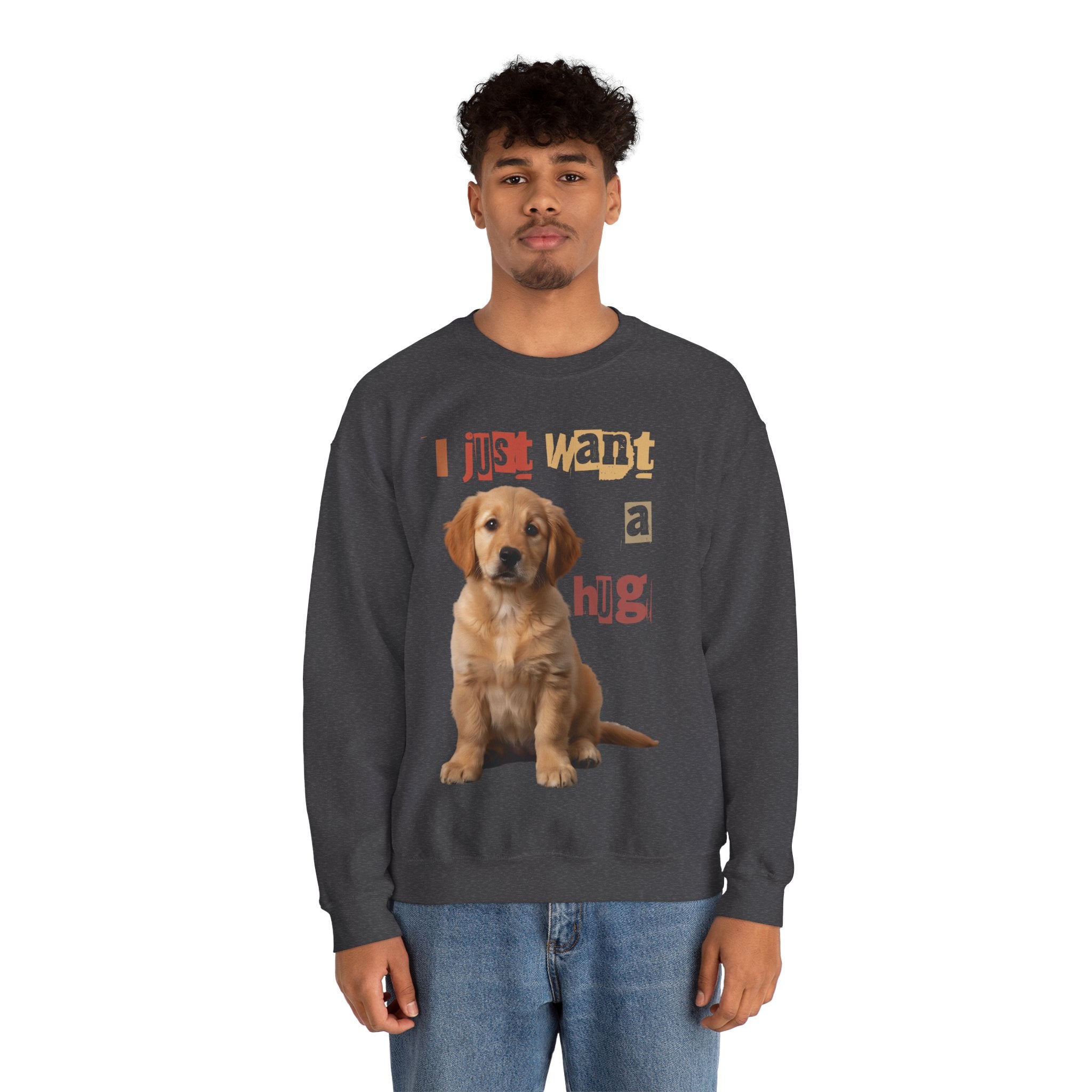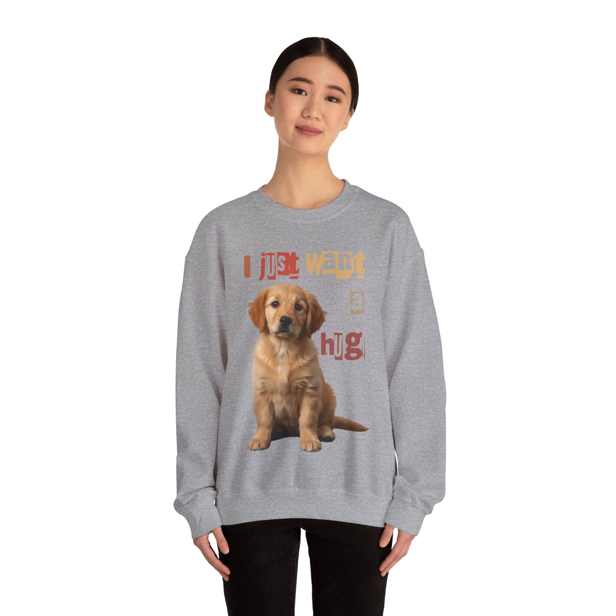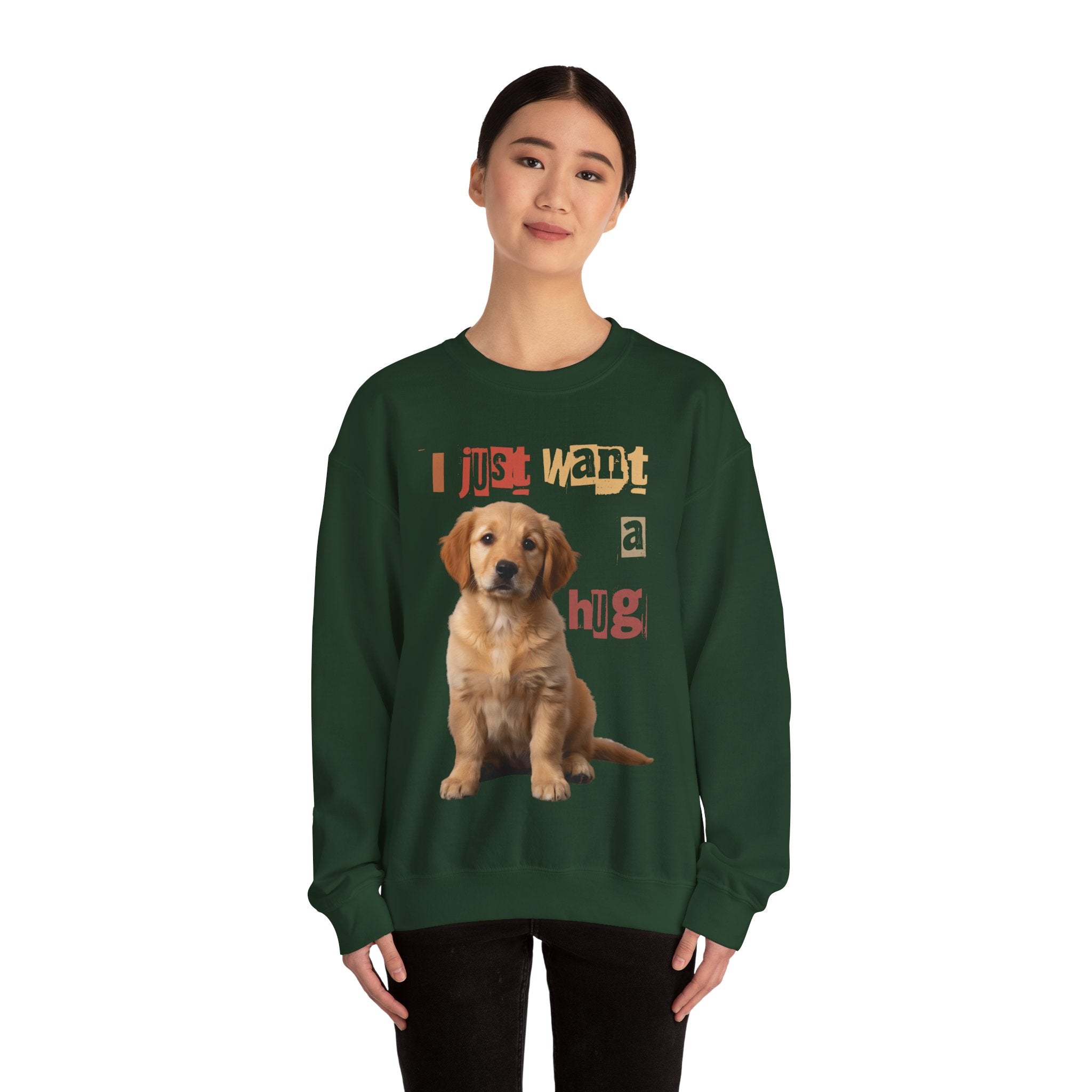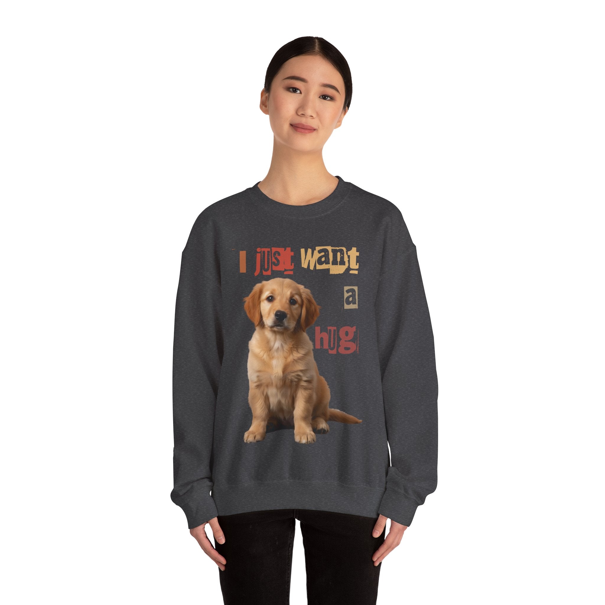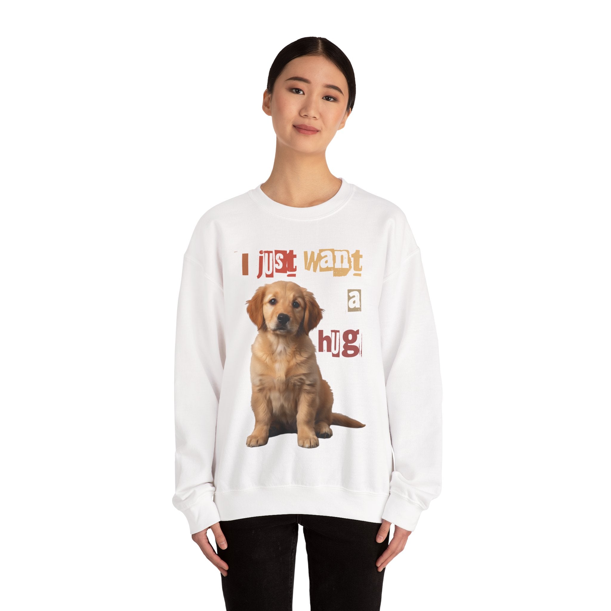 This cute Dog Hug Print Unisex Crewneck Sweatshirt brings a warm and playful vibe to your everyday wardrobe. Featuring a wide-eyed ginger dog with retro-style lettering that saysI just want a hug,this sweatshirt offers instant comfort and a touch of nostalgia. Crafted from a medium-heavy 50/50 cotton-poly blend, it ensures both comfort and durability. The ribbed collar, double-needle stitching, and tear-away neck label add to its quality. Perfect for layering on cool days or lounging around at home, this sweatshirt is ethically made cotton with OEKO-TEX certified dyes. Embrace cozy moments with this charming piece.