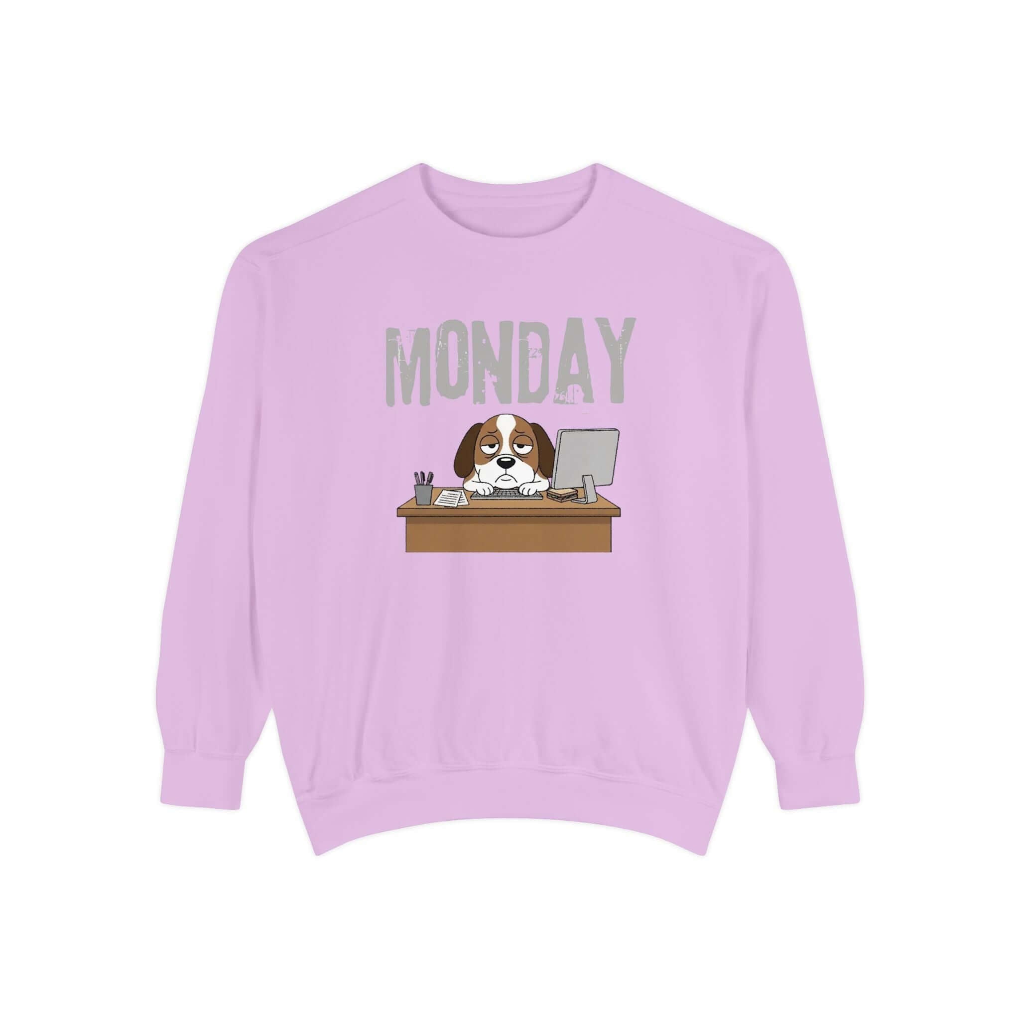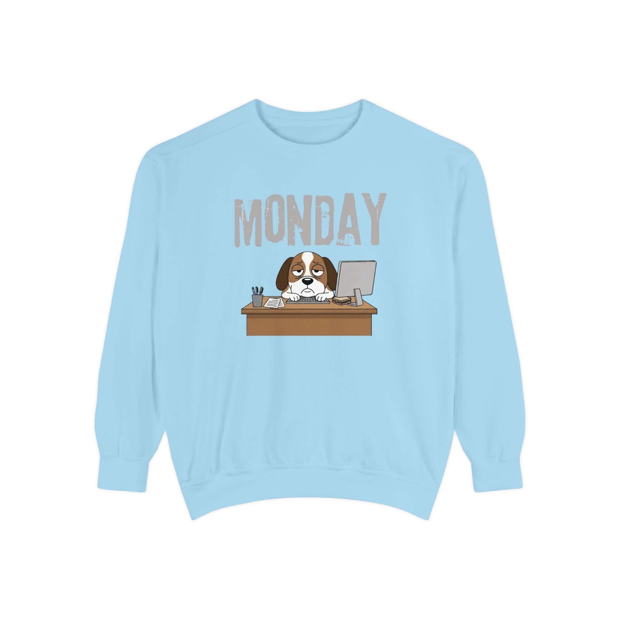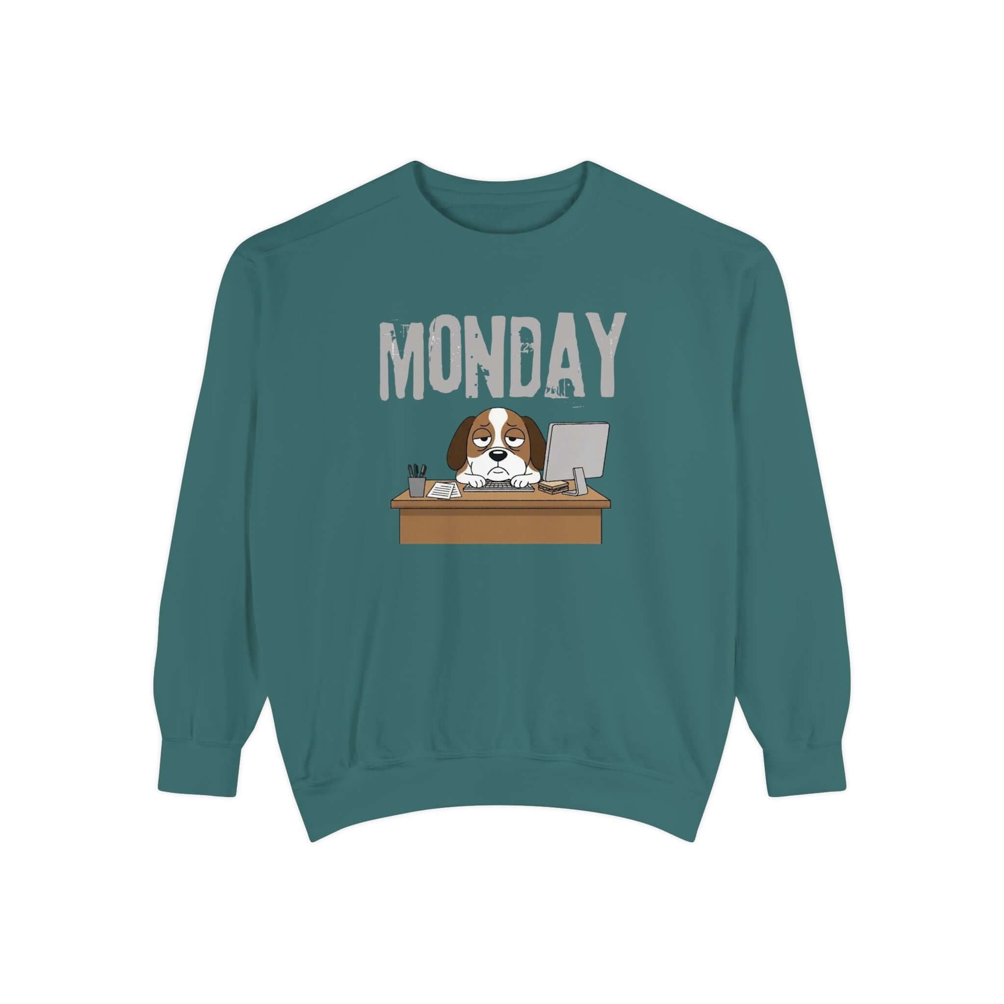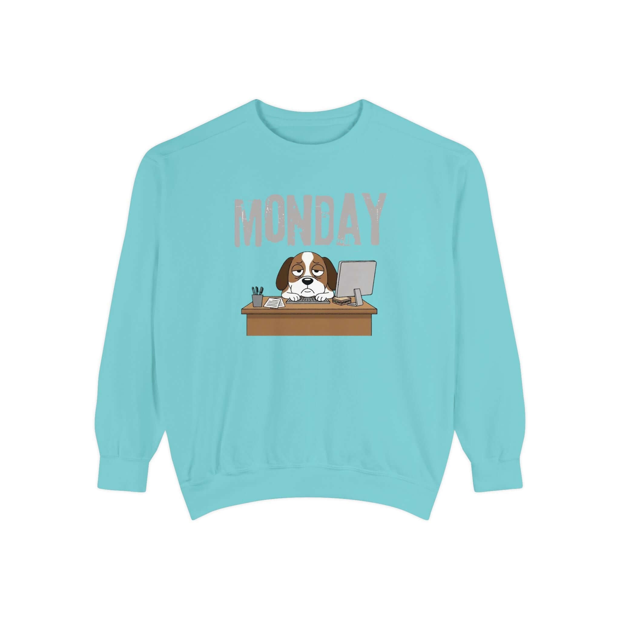 Embrace your Monday mood with our Dog Face Monday Unisex Crewneck Sweatshirt in Chalky Mint. This relaxed-fit sweatshirt offers a soft, lived-in feel perfect for cozy mornings or casual days. Featuring a dog staring blankly under a stamped “MONDAY” banner, the subtle OEKO-TEX dyed color and optional chest embroidery add thoughtful details. Crafted from 80% ring-spun cotton and 20% polyester blend, this medium-heavy fabric sweatshirt ensures a comfortable fit. It includes 1×1 ribbed collar, cuffs, and hem for stretch-and-recovery fit, as well as sewn-in twill neck tape and a half-moon back patch for stability and comfort. Show off your style with this durable and stylish sweatshirt. Available in a range of sizes. Care instructions: Machine wash cold, non-chlorine bleach when needed, tumble dry on low heat, do not iron, do not dry clean.