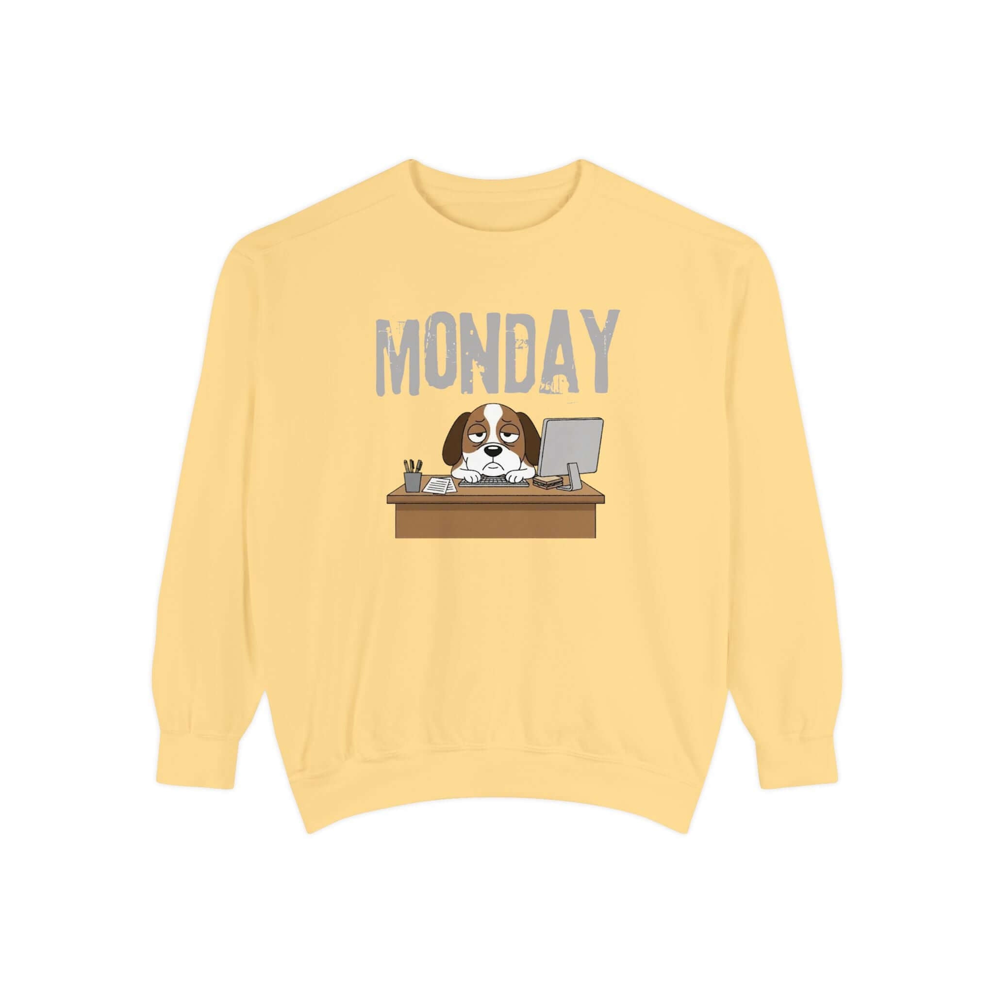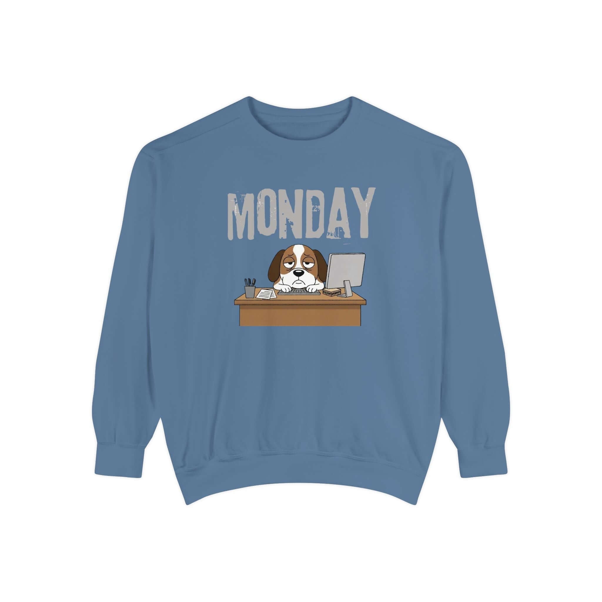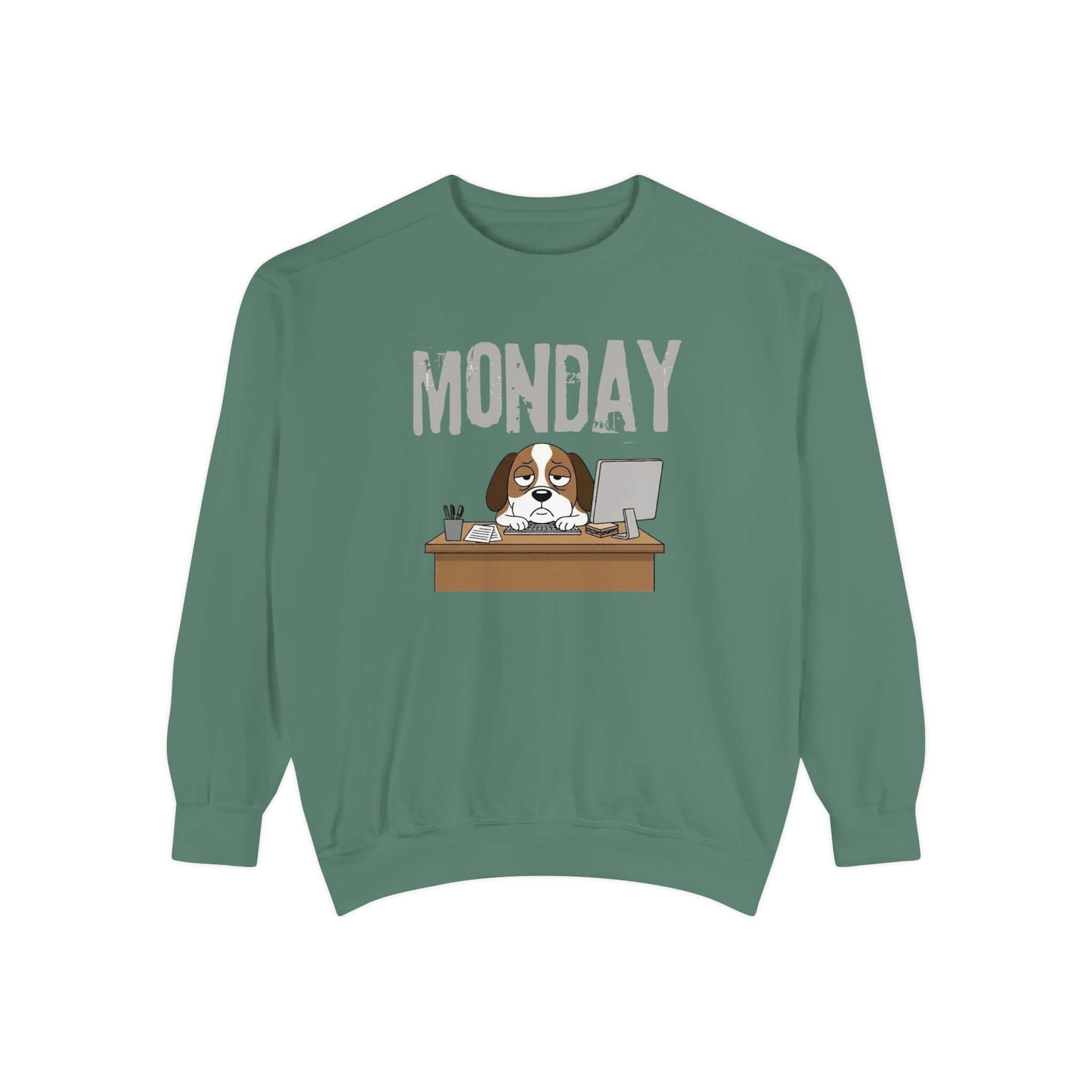 Embrace your Monday mood with our Dog Face Monday Unisex Crewneck Sweatshirt in Chalky Mint. This relaxed-fit sweatshirt offers a soft, lived-in feel perfect for cozy mornings or casual days. Featuring a dog staring blankly under a stamped “MONDAY” banner, the subtle OEKO-TEX dyed color and optional chest embroidery add thoughtful details. Crafted from 80% ring-spun cotton and 20% polyester blend, this medium-heavy fabric sweatshirt ensures a comfortable fit. It includes 1×1 ribbed collar, cuffs, and hem for stretch-and-recovery fit, as well as sewn-in twill neck tape and a half-moon back patch for stability and comfort. Show off your style with this durable and stylish sweatshirt. Available in a range of sizes. Care instructions: Machine wash cold, non-chlorine bleach when needed, tumble dry on low heat, do not iron, do not dry clean.