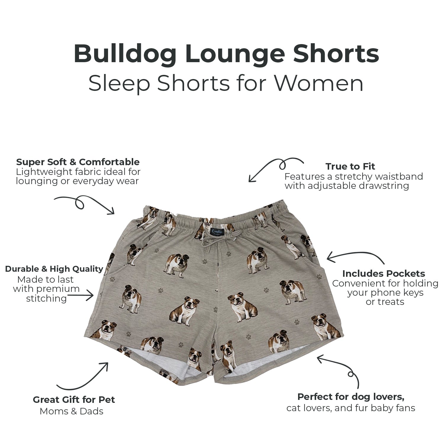Embrace your love for dogs with our stylish Womens Bulldog Print Lounge Shorts, crafted from soft, breathable fabric for summer comfort. These shorts feature a roomy fit, an elastic waistband, and deep side pockets for added convenience. Perfect for dog moms and pet lovers, these shorts are ideal for lounging, running errands, or vacations. Treat yourself or gift these comfy shorts for birthdays, Mothers Day, or any special occasion. Available exclusively at PrimePetGifts.com, your go-to pet lover boutique