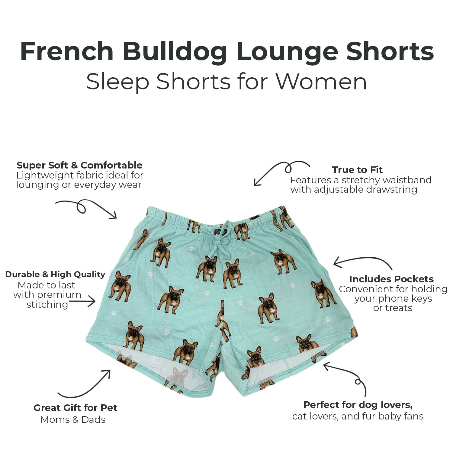 Indulge your love for dogs with these charming Womens French Bulldog Lounge Shorts. Crafted from soft, breathable fabric, these shorts offer all-day comfort and feature cute French Bulldog prints. The elastic waistband and deep side pockets add practicality to the stylish design — perfect for dog moms and pet lovers. Whether relaxing at home, running errands, or enjoying a summer vacation, these comfy shorts are a delightful choice. Treat yourself or surprise a fellow pet lover with the perfect gift for any occasion. Experience superior quality .com today!